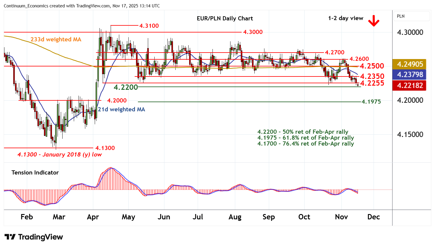 12:50 GMT - Cautious trade is giving way to a move lower, with prices currently pressuring critical support at the 4.2200 Fibonacci retracement and the 4.2255 weekly low of 9 April. Daily studies and broader weekly charts continue to track lower, highlighting a bearish tone and room for further losses in the coming sessions. A close beneath here will complete a multi-month distribution top beneath the 4.3100 current year high of 16 April, as focus then turns to 4.1975/00. Meanwhile, resistance remains at congestion around 4.2350. A close above here, if seen, will help to stabilise price action and prompt consolidation beneath further congestion around 4.2500.