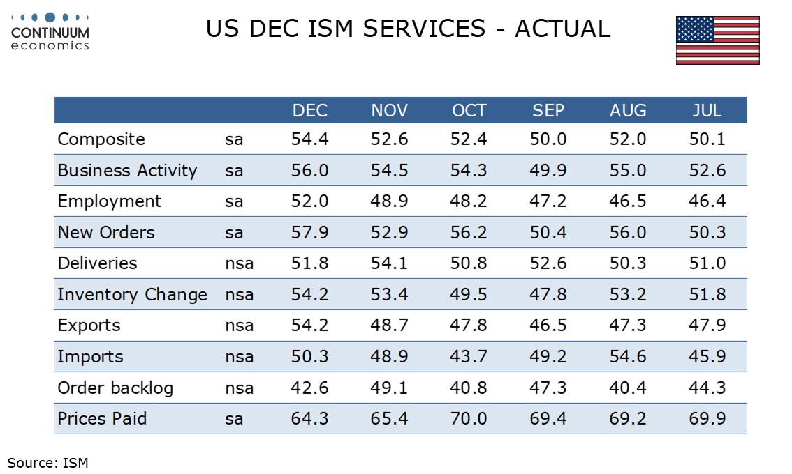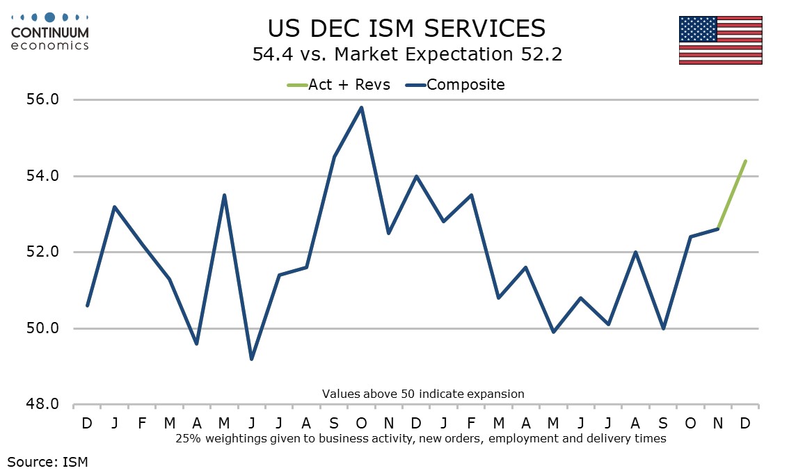 December’s ISM services index at 54.4 from 52.6 is the strongest since October 2024 with positive details. While some caution is needed with other surveys less impressive the ISM services strength probably outweighs weakness in November’s JOLTS report, where openings fell by 303k to 7.146m.