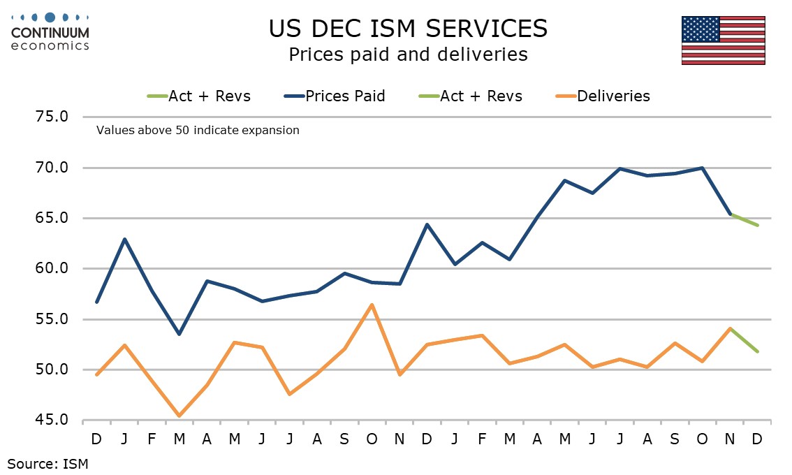 The only component of the composite to slip is delivery times, to 51.8 from a strong 54.1 in November. This could hint at reduced inflationary pressure. So do prices paid, which do not contribute to the composite, down only modestly to 64.3 from 65.4, but the lowest since March before the tariff announcement.