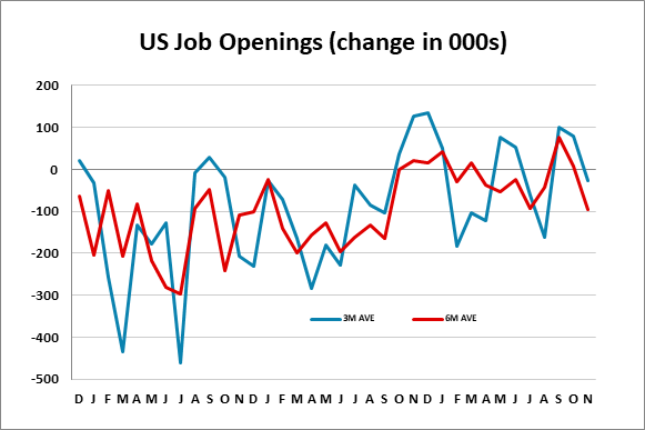 November’s JOLTS data shows job openings down by 303k after a downwardly revised 209k decline in October, which more than fully reverses a 431k increase in September. This turns the 3-month and 6-month averages negative again after both turned positive in September and October but the message of the data is more that September’s strength was misleading than the subsequent slippage is alarming.