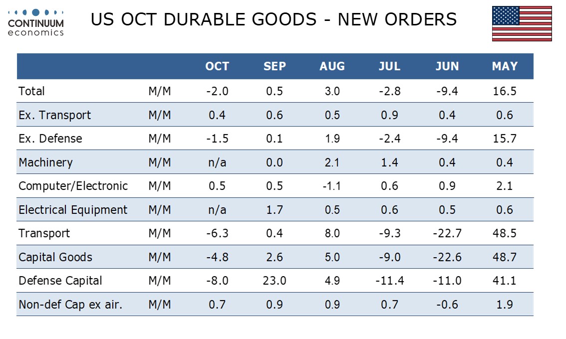 Transport is likely to see a significant dip, with Boeing orders weaker in October, auto sales softer and defense (which has a large overlap with transport) likely to correct from a strong September. Ex-defense we expect a decline of 1.5%.