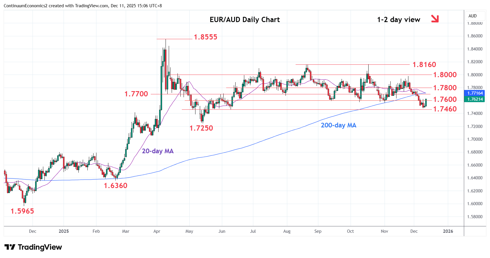 07:10 GMT - Turned up from the 1.1480 low as prices consolidate losses from the 1.7978, November swing high and unwind oversold daily studies. Bounce to regain the 1.7600 level see room for stronger bounce to resistance at the 1.7700/1.7800 area which is expected to cap and give way to renewed selling pressure later. Break of the 1.7480 low and 1.7460 support will extend the broader losses from the 1.8160 August/October double top and open up room for extension to the 1.7400 congestion. Below here will turn focus to the 1.7250, May low.