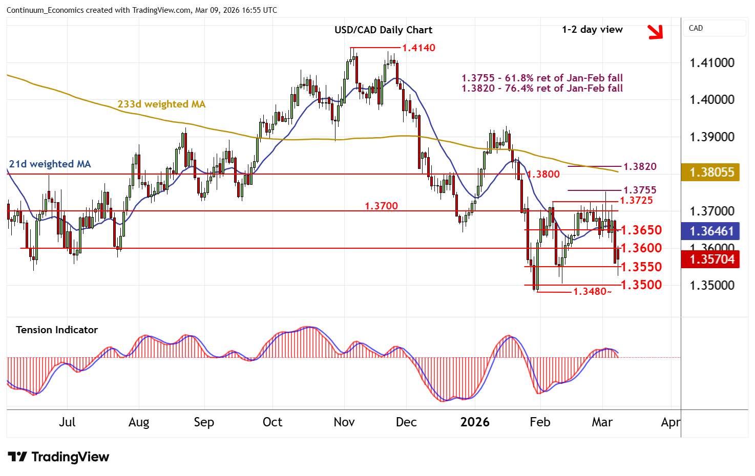16:45 GMT - The anticipated break below 1.3550 has bounced from 1.3525, as oversold intraday studies unwind, with prices currently trading around 1.3565. Daily readings continue to track lower and broader weekly charts are also bearish, highlighting room for a later break back beneath here towards strong support at the 1.3480~ current year low of 30 January and congestion around 1.3500. By-then oversold daily stochastics could limit any initial tests in consolidation, before further losses unfold. Meanwhile, resistance is lowered to congestion around 1.3600 and extends to 1.3650. This range should cap any immediate tests higher.