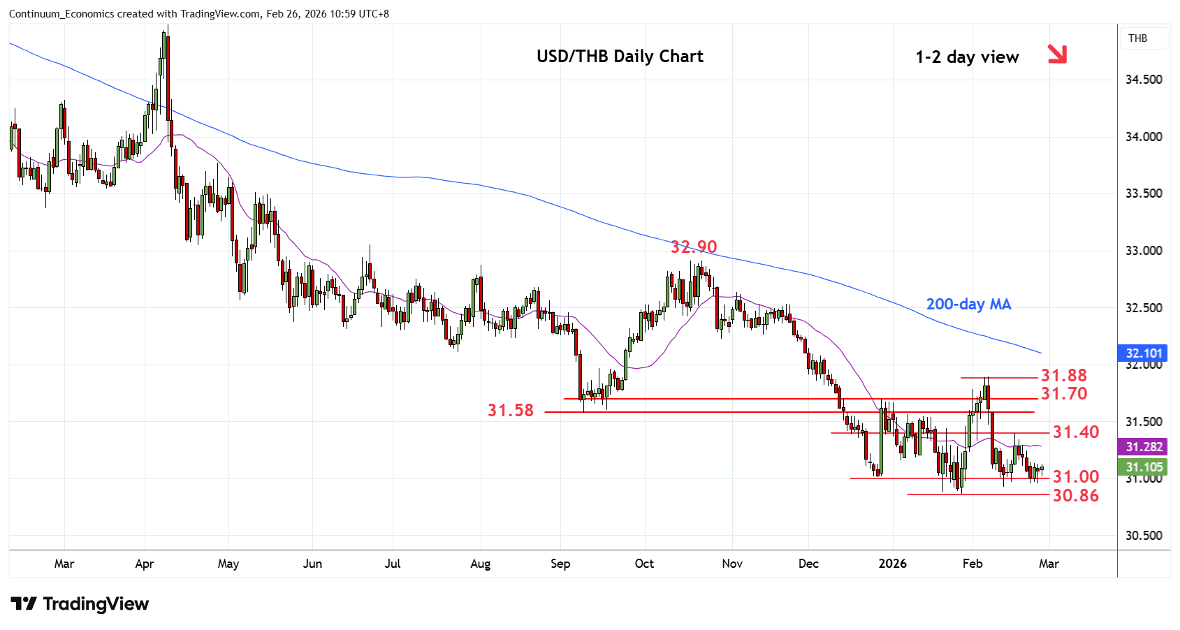 03:00 GMT - Little change, as prices extend consolidation within a narrow range above the 31.00 level. However, pressure remains on the downside and break here will expose the 30.86 January current year low to retest. Negative daily and weekly studies suggest scope for break here to further extend the broader losses from the October 2022 year high. Below this will see room for extension to the 30.80 congestion and the 30.65/30.50 area. Meanwhile, resistance at the 31.20/31.40 congestion area is expected to cap and sustain losses from the 31.88, 6 February swing high.