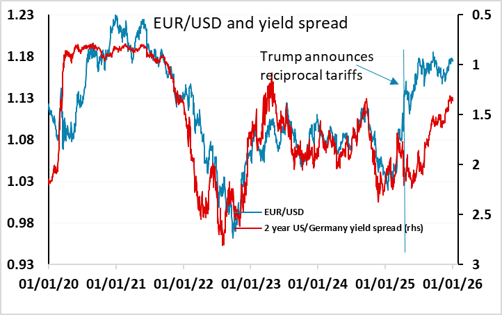 The US employment report and the Eurozone provisional December HICP data are the main numbers due this week, and our forecasts suggest some downside risks for EUR/USD, with our payroll forecast above consensus and our HICP forecast below consensus, albeit relatively modestly. As it stands, EUR/USD remains one of the few USD pairs in which the USD is underperforming the movements in yield spreads over the past year, and with the EUR curve completely flat, there is scope for softer inflation numbers to lead to some decline in EUR yields from here. While the correlation of EUR/USD with yield spreads has been fairly weak in the last year, we would expect any emergence of expectations of ECB easing to lead to a softer EUR.