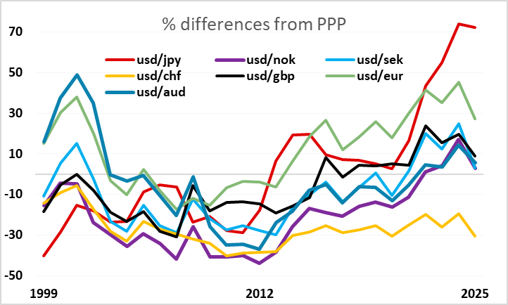 Elsewhere CPI data is due in Switzerland and Scandinavia. We continue to see scope for a NOK revaluation against the CHF, EUR and SEK, given its low historic level, attractive yield spreads and underlying solid Norwegian economy. However, market confidence has, much like the JPY, been undermined by recent poor performance, and there is always concern that the Norwegian government pension fund always has a lot of NOK to sell on any recovery. Even so, EUR/NOK looks toppy at 12, NOK/SEK has never traded below 0.90 for any length of time, and CHF/NOK looks toppy at 13, so risks should be on the NOK upside.