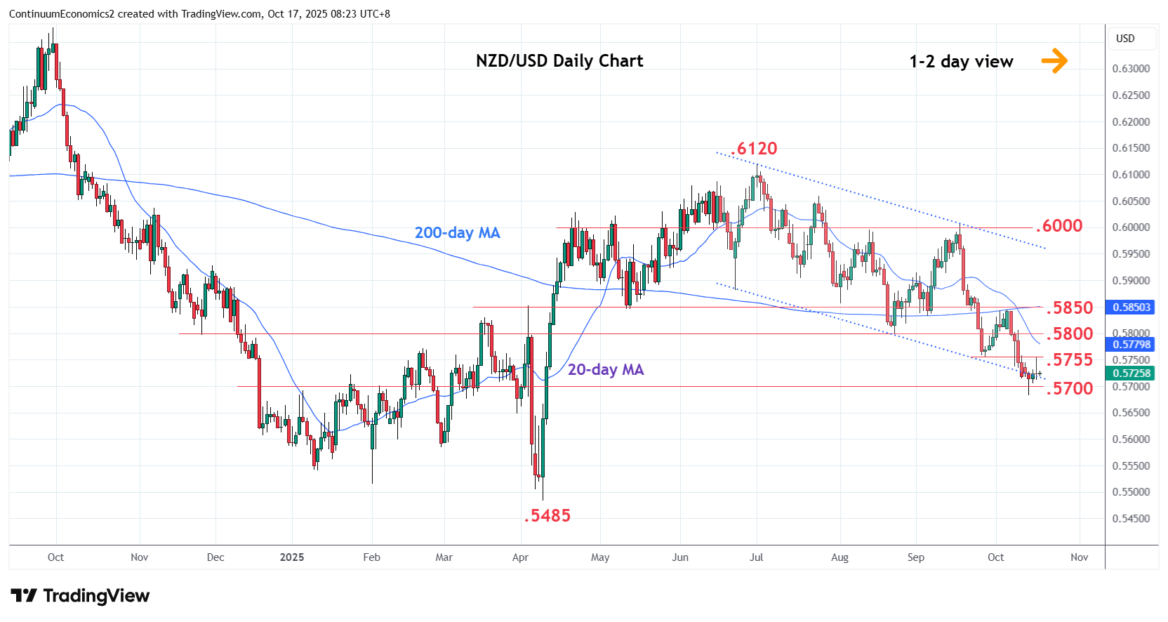 00:25 GMT - Higher in consolidation above the .5700 level as prices unwind oversold daily studies to reach resistance at the .5755, September low. Break here will open up room for stronger bounce to resistance at the .5800 level and August low which is expected to cap. Regaining this will fade the downside pressure and clear the way for stronger gains to retrace losses from .6000 level. Meanwhile, support at the .5700/.5683 area now underpin. Below here will see room for extension to support at the .5650/.5635 congestion and 76.4% Fibonacci level.