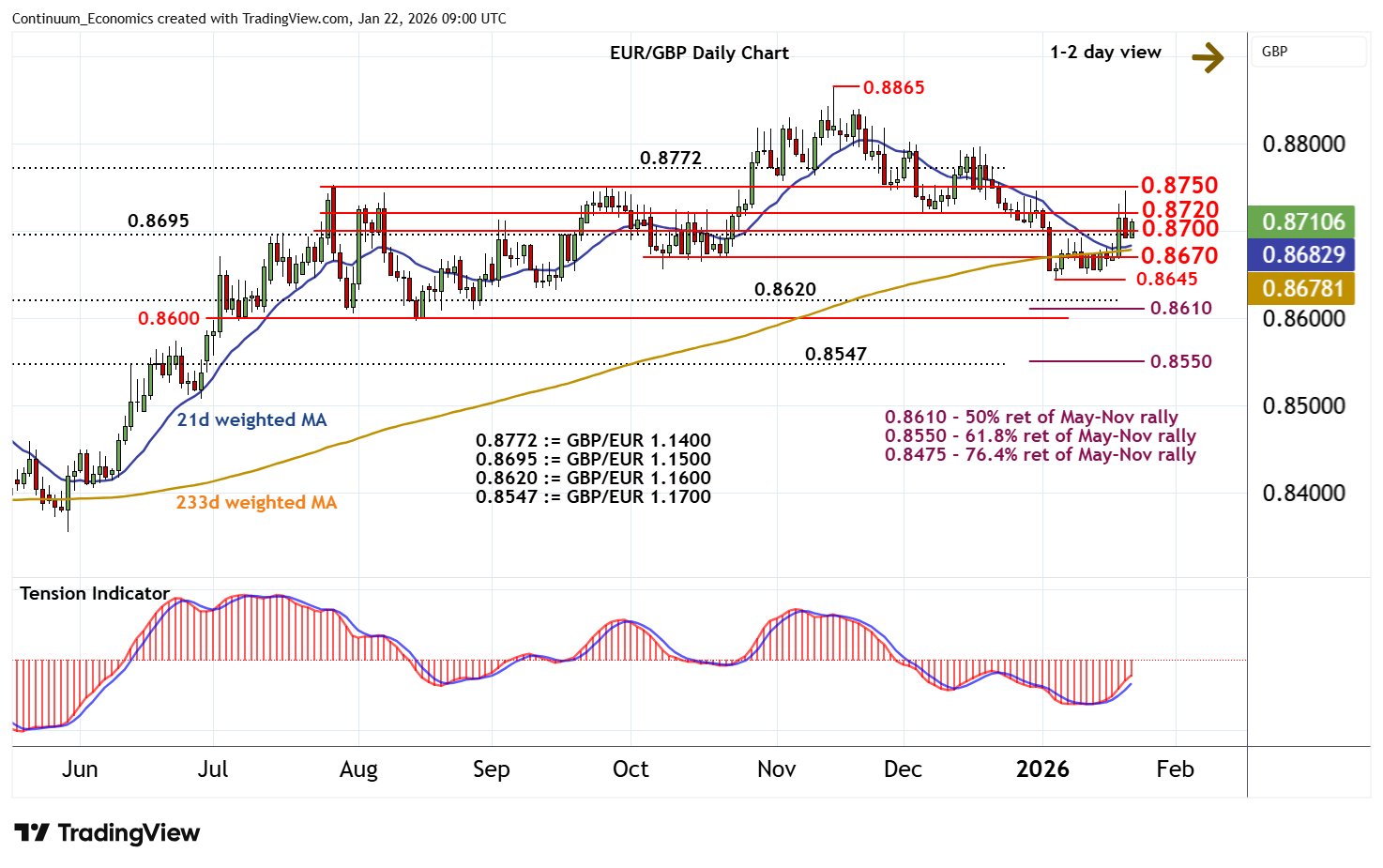 The anticipated test of support at 0.8695, (GBP/EUR 1.1500), and congestion around 0.8700 is giving way to a bounce