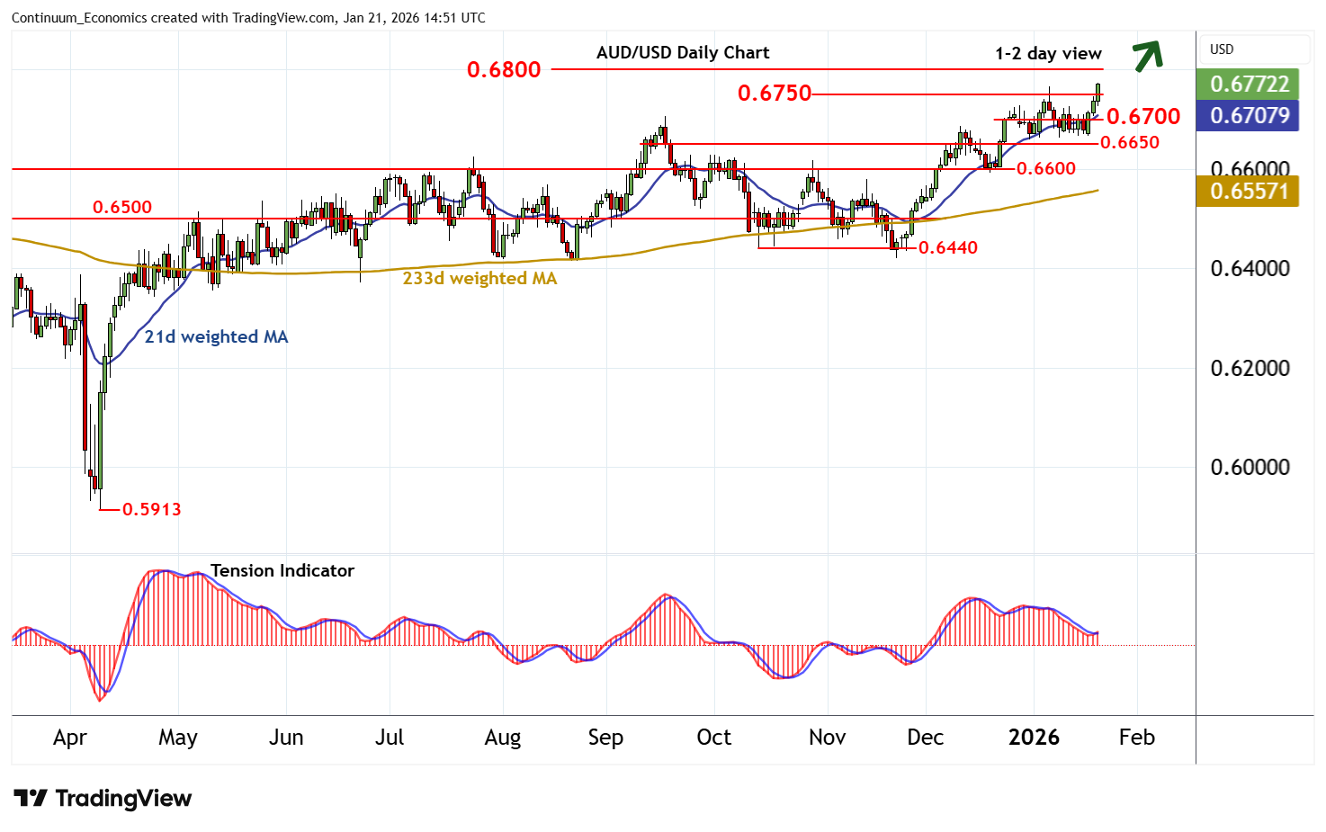 14:45 GMT - Cautious trade has given way to anticipated gains, with prices currently balanced around fresh 2026 year highs at 0.6773~. Daily readings continue to improve and broader weekly charts are also rising, highlighting room for continuation of broad April 2025 gains towards 0.6800. Beyond here is the 0.6900/42 range, where already overbought weekly stochastics should prompt significant profit-taking. Meanwhile, a close back below 0.6750 would turn sentiment neutral and prompt consolidation around congestion support at 0.6700.