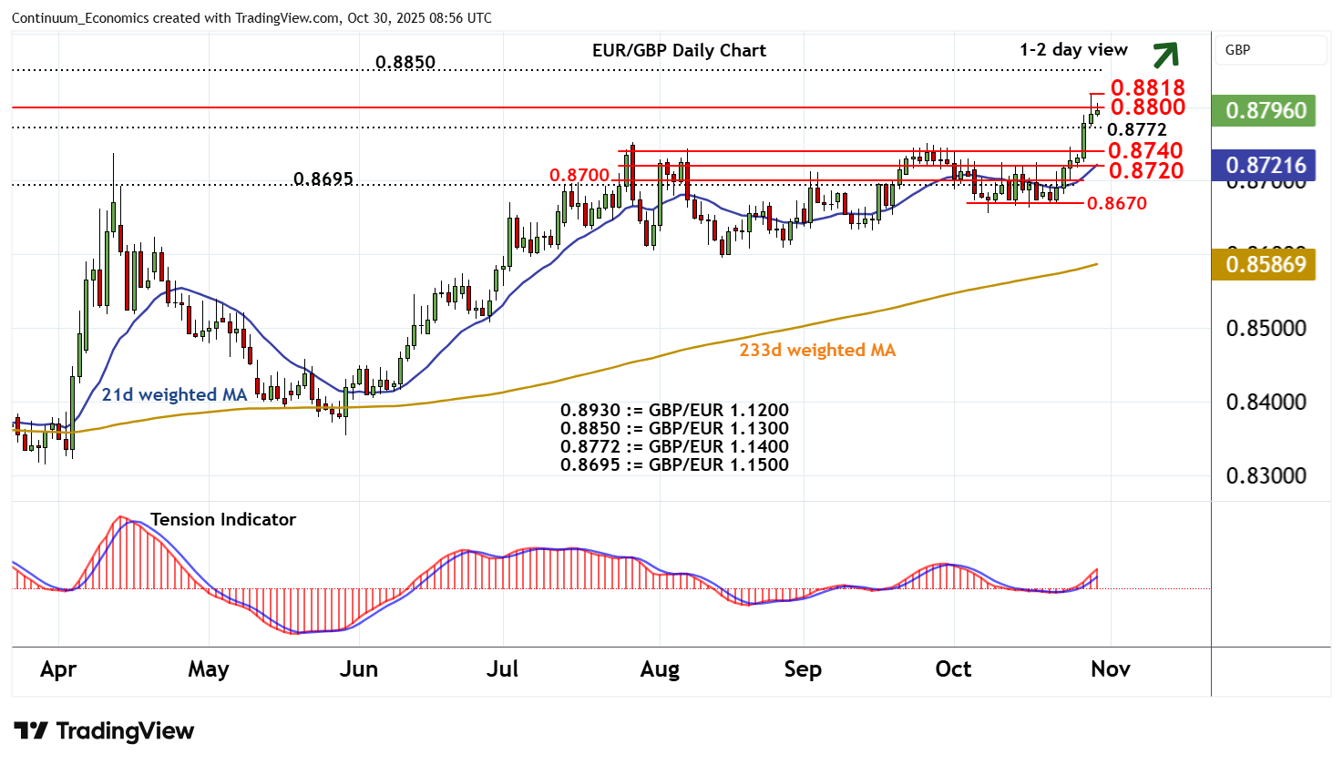 08500 GMT - The anticipated break above 0.8800 has posted a fresh 2025 year high at 0.8818, before turning back into consolidation around 0.8800. Intraday studies are falling and overbought daily stochastics are flat, suggesting potential for a deeper reaction. But the positive daily Tension Indicator and improving weekly charts should limit scope in renewed buying interest above support at 0.8772, (GBP/EUR 1.1400). A later break above 0.8800/18 will improve sentiment and open up strong resistance at 0.8850, where fresh consolidation is expected to appear. Meanwhile, a close below 0.8772 would add weight to sentiment and give way to consolidation within 0.8720/40.