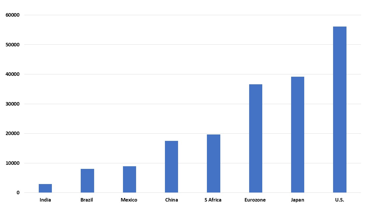 · AI labor replacement: DM and China more than other EM’s? Relative wage rates mean that AI labor replacement is a more realistic option in certain sectors in DM economies and China and less so in other EM economies. The IMF expects that broader AI adoption to be slower in EM ex China also due to lack of infrastructure or management to integrate AI (here). The U.S. and China will be the most closely watched, given they are leading the way – though the bias for economists will be towards the U.S. given the better data.