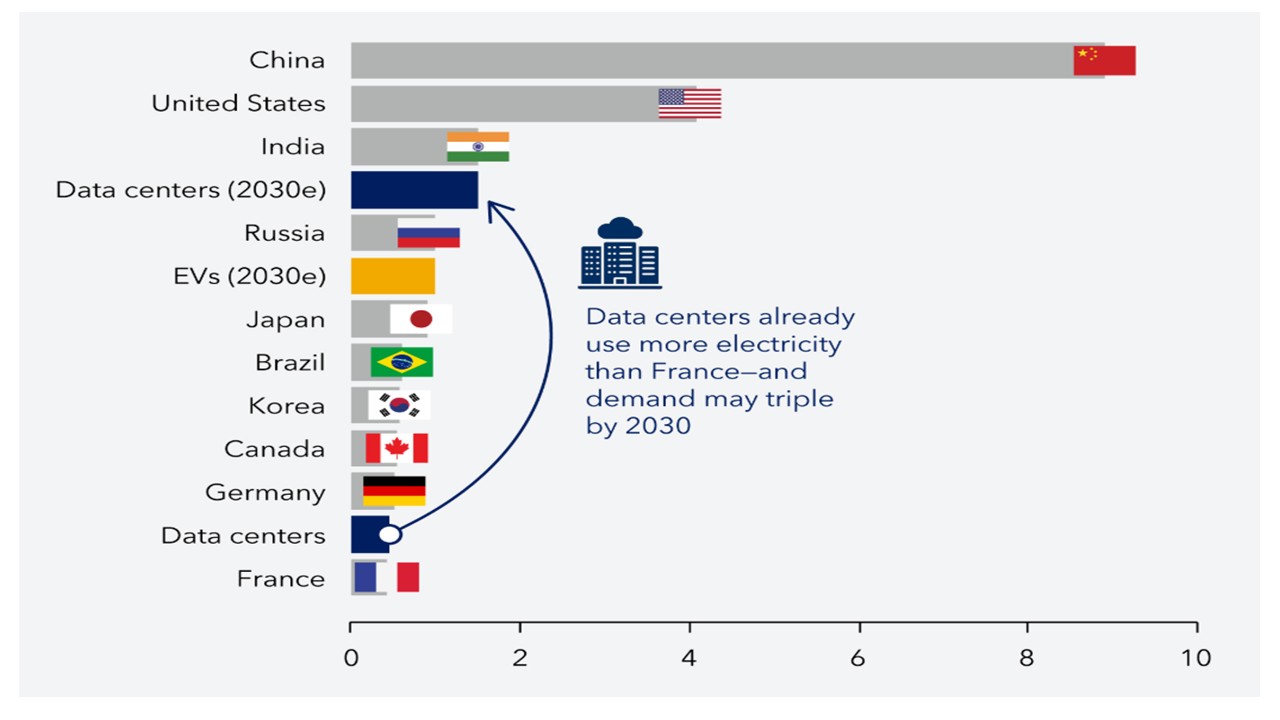 · Power/Commodity demand AI requires more power in data centres compared to existing technology setups (here), with an investment wave in power already under way lead by the U.S. says the IMF (here and Figure 1). However, it could prompt an increase in overall U.S. power costs, if new fuel supply cannot keep pace with the extra power demand from AI. Other countries are less advanced in AI server centres and associated power build up. More generally, China is still pushing forward with a major solar power expansion, both for energy security and also climate change reasons. EU/UK are slower in building extra overall capacity, with the focus remaining on new renewables but retiring fossil fuel power generation. Additionally, it is worth mentioning that China trend growth slowdown in the 2nd half of the 2020’s will reduce commodity demand, which is important given China’s dominant demand in certain commodities.