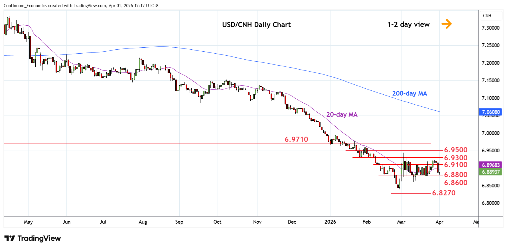 04:20 GMT - Break of support at the 6.9100 level has given way to deeper pullback to 6.8800 support as daily studies unwind overbought readings. Break here will fade the upside pressure and see room for pullback to 6.8600 March low. Below the latter will open up the 6.8270 February YTD low to retest and threatens break and further retrace the 2022/2025 rally. Meanwhile, resistance is lowered to the 6.9100 congestion which should cap and sustain rejection from the 6.9270 Monday's high.