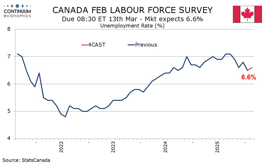 We expect Canadian employment to increase by 50k in February, more than fully reversing a 24.8k decline in January to keep trend modestly positive. However we expect an even stronger rebound in the labor force from a decline in January to lift the unemployment rate to 6.6% from 6.5%, while remaining below December’s 6.8%.