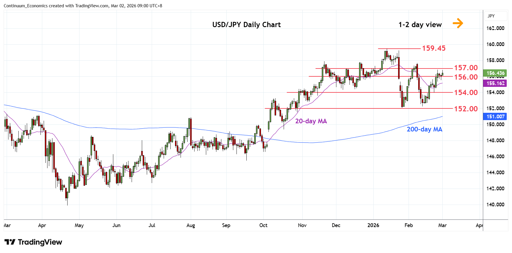 Chart USD/JPY Update: Higher in consolidation to retest 156.82 high