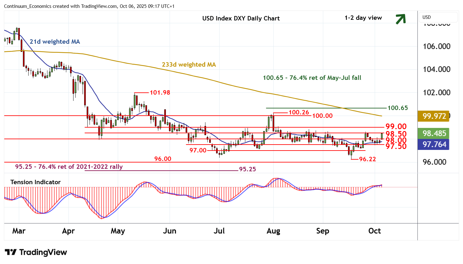 09:10 BST - Cautious trade is giving way to a sharp push higher, with prices approaching congestion resistance at 98.50. Intraday studies have ticked higher and daily readings are rising, highlighting room for continuation beyond here towards further congestion around 99.00. However, already overbought intraday and daily stochastics are expected to limit any initial tests in consolidation, before rising weekly charts prompt further gains. Meanwhile, support is at congestion around 98.00. A close beneath here, if seen, will turn sentiment neutral and prompt consolidation above 97.50.