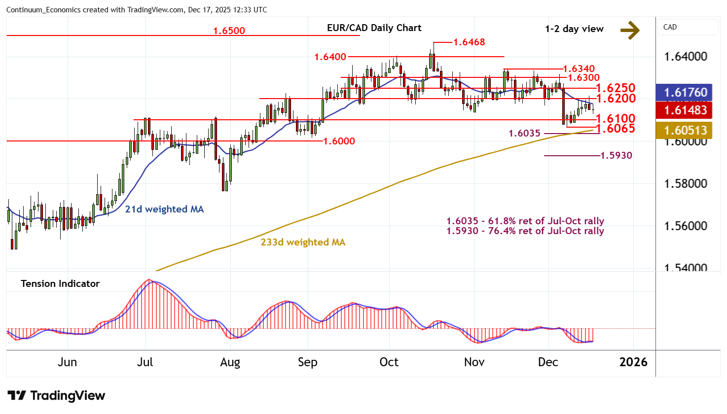11:55 GMT - The anticipated test above congestion resistance at 1.6200 has been pushed back from 1.6251, intraday studies turn down, with prices currently balanced around 1.6150. A test beneath here cannot be ruled out, opening up congestion support at 1.6100. But rising daily readings are expected to limit any initial tests in consolidation, before mixed/negative weekly charts prompt further losses. A close below the 1.6065 weekly low of 8 December would turn sentiment negative and extend mid-October losses towards the 1.6035 Fibonacci retracement. Meanwhile, any fresh tests above 1.6200 should meet renewed selling interest beneath congestion resistance at 1.6250.