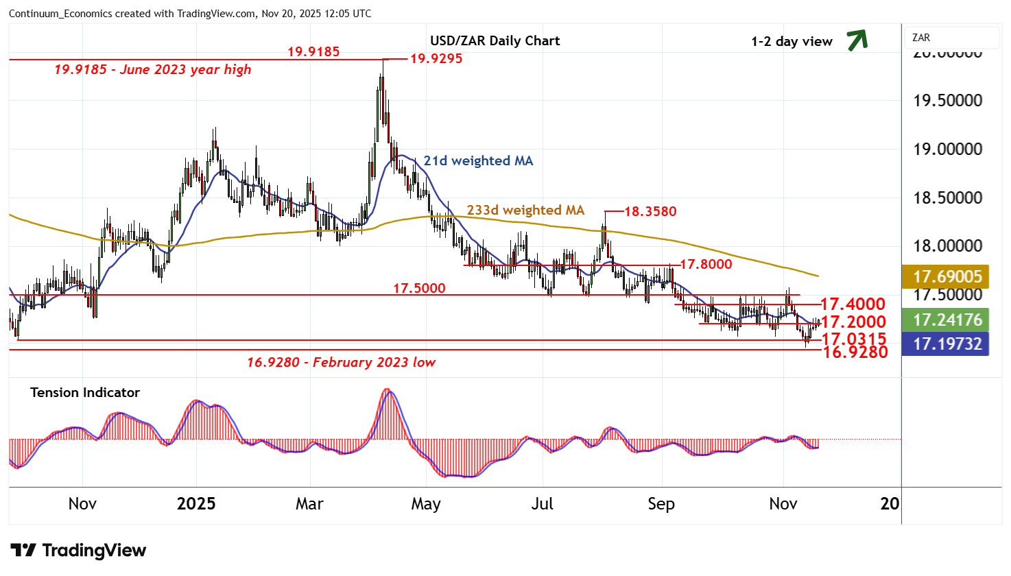 12:00 GMT - The anticipated drift lower towards critical support within 16.9280 - 17.0315 has not been seen, as prices extend cautious trade around congestion resistance at 17.2000. Daily readings are rising, highlighting potential for a test of congestion resistance at 17.4000. But mixed weekly charts should limit any further strength in renewed selling interest/consolidation beneath 17.5000. Meanwhile, a close below 16.9280 - 17.0315, not yet seen, will turn sentiment negative and confirm continuation of May 2023 losses.