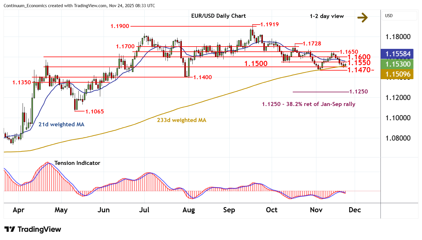 08:20 GMT - Little change, as prices extend choppy trade above congestion support at 1.1500. Intraday studies are rising, highlighting room for a test of resistance at the 1.1550 break level. However, negative daily readings and deteriorating weekly charts should limit any break in renewed selling interest/consolidation towards congestion around 1.1600. Following cautious/corrective trade, fresh losses are looked for. A later break below 1.1500 will open up stronger support at the 1.1470~ weekly low of 5 November. Further selling interest will turn sentiment outright negative and confirm continuation of mid-September losses, initially to 1.1400.