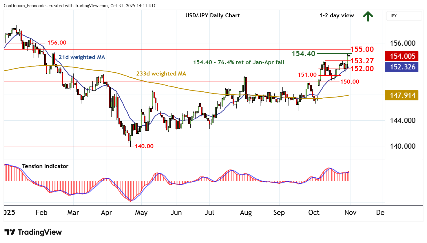 13:55 GMT - Little change, as prices extend consolidation beneath strong resistance at the 154.40 Fibonacci retracement. Intraday studies are under pressure, highlighting potential for a minor pullback. But rising daily readings and positive weekly charts are expected to limit any tests lower in renewed buying interest towards the 153.27 weekly high of 10 October. Following cautious trade, fresh gains are looked for. A close above 154.40 will improve sentiment and extend April gains towards congestion around 155.00. Beyond here is the 155.88 high of February and congestion around 156.00. But flat overbought weekly stochastics are expected to limit any tests of here in profit-taking/consolidation. Meanwhile, a close below 153.27, if seen, would turn sentiment neutral and prompt consolidation above congestion around 152.00.