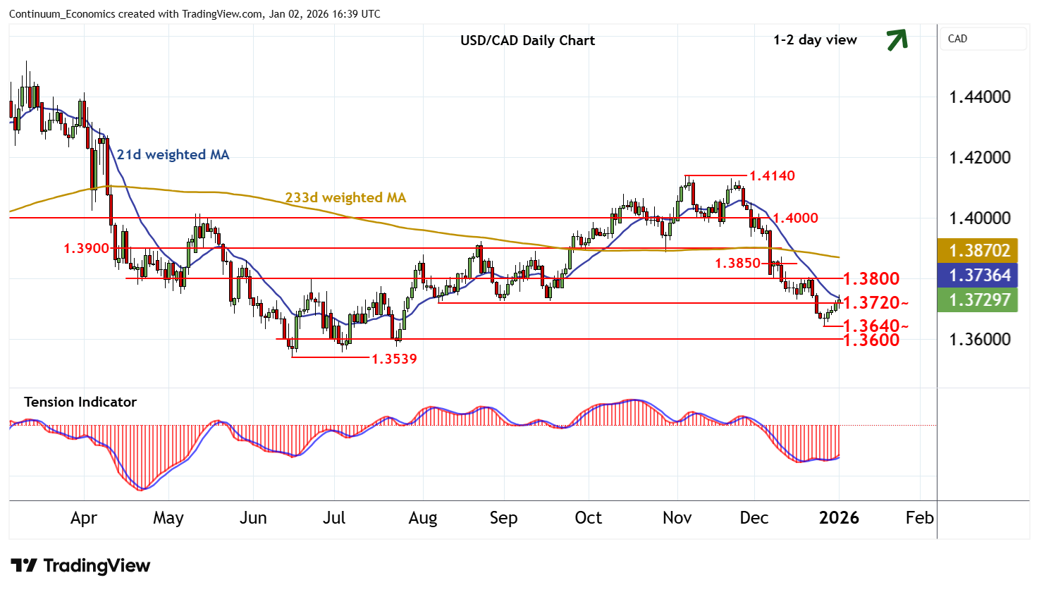 16:20 GMT - Anticipated gains have reached resistance at the 1.3720~ lows from August-September, where a tick lower in intraday studies is prompting short-term reactions. Daily readings continue to rise, highlighting room for a break above here. But mixed/negative weekly readings are expected to limit scope in renewed selling interest/consolidation beneath congestion around 1.3800. Meanwhile, support remains at the 1.3640 weekly low of 26 December. A close beneath here, not yet seen, would turn sentiment negative and extend November losses initially towards congestion around 1.3600.