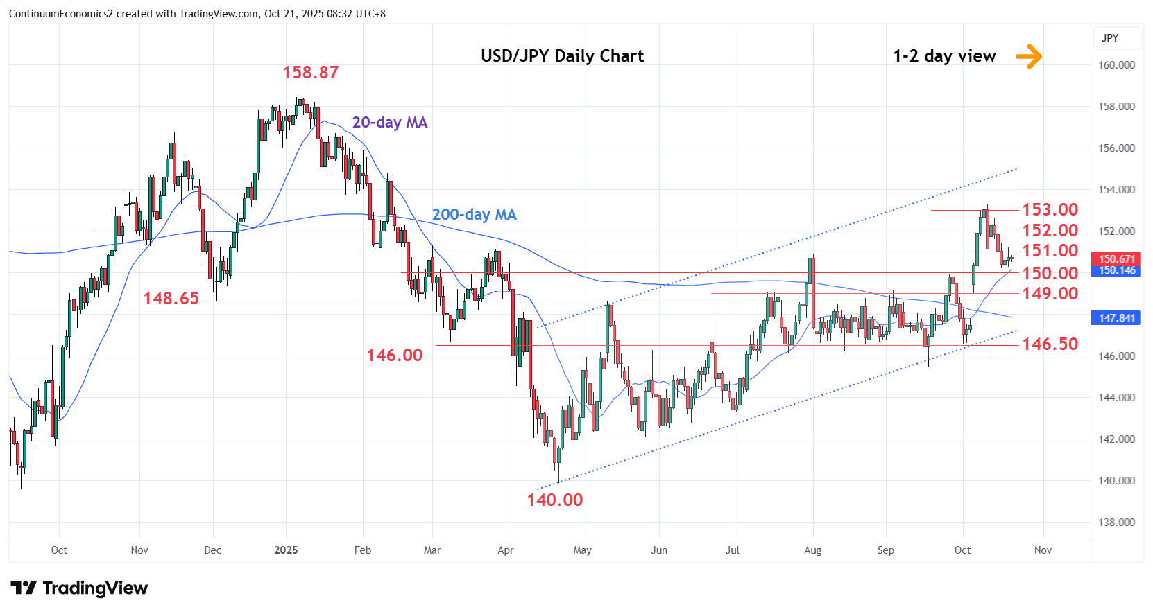 00:35 GMT - No follow-through on break of support at the 150.00 figure and subsequent bounce from 149.37 low see prices back to retest 151.00/10 resistance. Break here will open up room for stronger gains to retrace pullback from the 153.27 high towards the 152.00 level. However, gains are seen corrective and lower high sought to further pressure the downside later. Close below the 150.00 150.00 figure will open up room to the gap area starting at 149.00 low of last week and extending to 147.82, 3rd October high.