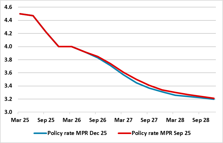 As expected, no change in policy and little shift in rhetoric and/or outlook was the message from the Norges Bank’s latest verdict. After two 25 bp cuts this year (to 4.0%), this month saw a second successive unchanged verdict with the policy outlook also retained (Figure 1). This was consistent with the Board’s repeated assertion that ‘the policy rate will be reduced further in the course of the coming year’. This December meeting came with both new forecasts and data, not least inflation and lending numbers, the latter possibly becoming a worry given the fresh slowing in corporate credit growth and weaker GDP backdrop. But with underlying inflation dynamics being friendly (Figure 2), we still think that the Norges Bank is being far too cautious as it plans to keep policy very restrictive through the projected timeframe out to 2028; we wonder why the Board therefore only sees inflation a little higher and only just approaching the 2% target by the end of that period.