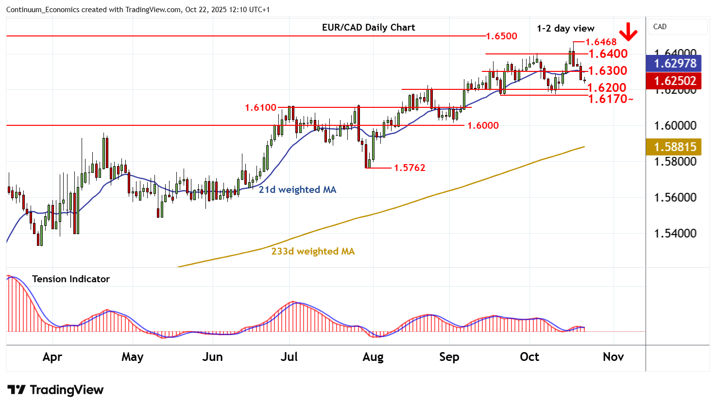 12:00 BST - The anticipated break below 1.6300 has reached 1.6235, where oversold intraday studies are prompting short-term reactions. Daily readings have turned down and broader weekly charts are also falling, highlighting room for further losses towards congestion around 1.6200. Beneath here is stronger support at the 1.6170~ weekly lows from mid-September to mid-October. A close beneath here would add weight to sentiment and confirm a near-term top in place at the 1.6468 current year high of 17 October, as deeper losses then focus on 1.6100/15. Meanwhile, a close back above 1.6300 would help to stabilise price action and prompt consolidation beneath further congestion around 1.6400.
