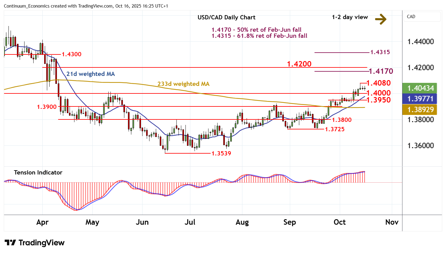 16:10 BST - Still little change, as prices extend consolidation beneath resistance at the 1.4080 high of 14 October. The rising daily Tension Indicator and overbought daily stochastics are flattening, suggesting room for further consolidation, before positive weekly charts extend June gains still further. A later break above 1.4080 will turn sentiment positive and open up the 1.4170 Fibonacci retracement. But already overbought weekly stochastics could limit any initial tests in profit-taking/consolidation. Meanwhile, support remains at 1.4000. A close beneath here would delay higher levels and give way to consolidation above 1.3950.