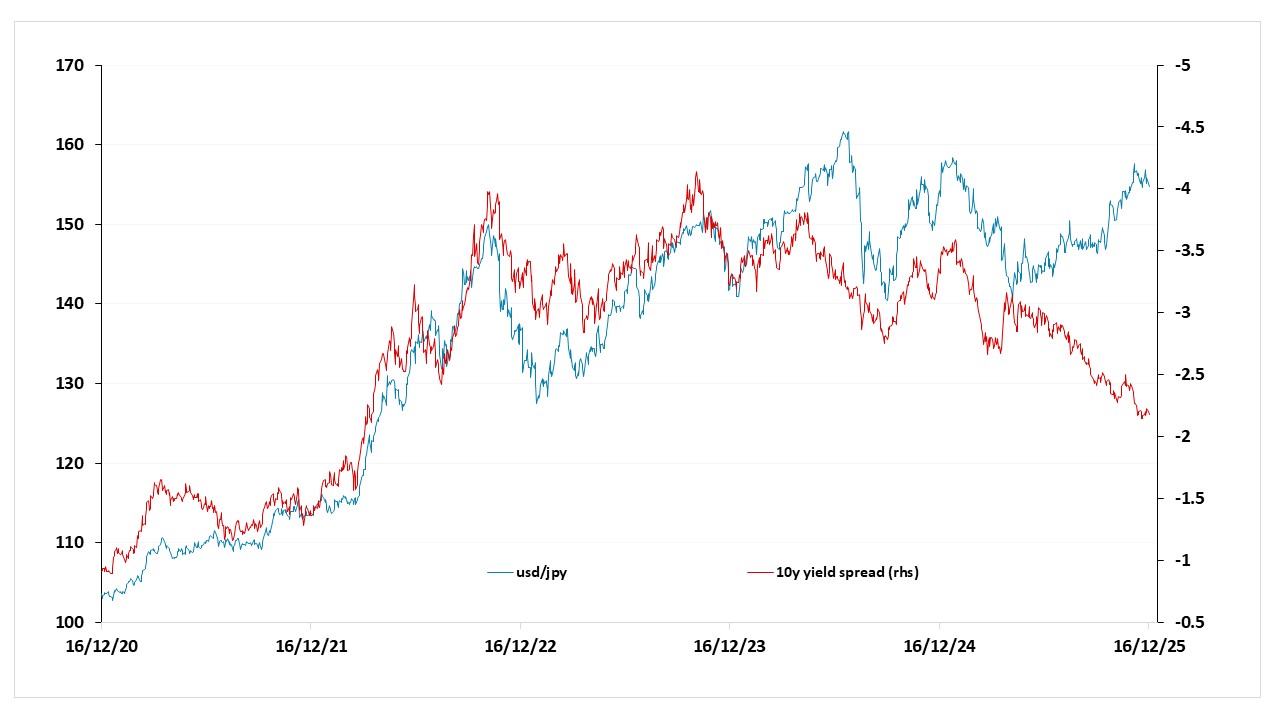 Q4 saw the JPY weaken significantly with the election of Takaichi as the LDP leader and Prime Minister being the trigger. There were some concerns expressed about the potential for Takaichi to follow “Abenomics” – involving both easier fiscal and monetary policy. However, while Takaichi has passed an expansionary budget, it is not substantially different from previous budgets, and more importantly, monetary policy and QT is still being left to the BoJ. Typically, expansionary fiscal policy is currency positive if accompanied by independent monetary policy because it will normally lead to higher yields than would otherwise have been the case, and all the indications are that the BoJ will continue on its tightening cycle provided that the economy shows the expected nominal growth. JGB yields have moved significantly higher in recent months, and the historic relationship between yield spreads and USD/JPY suggests USD/JPY should already be a lot lower (Figure 1).