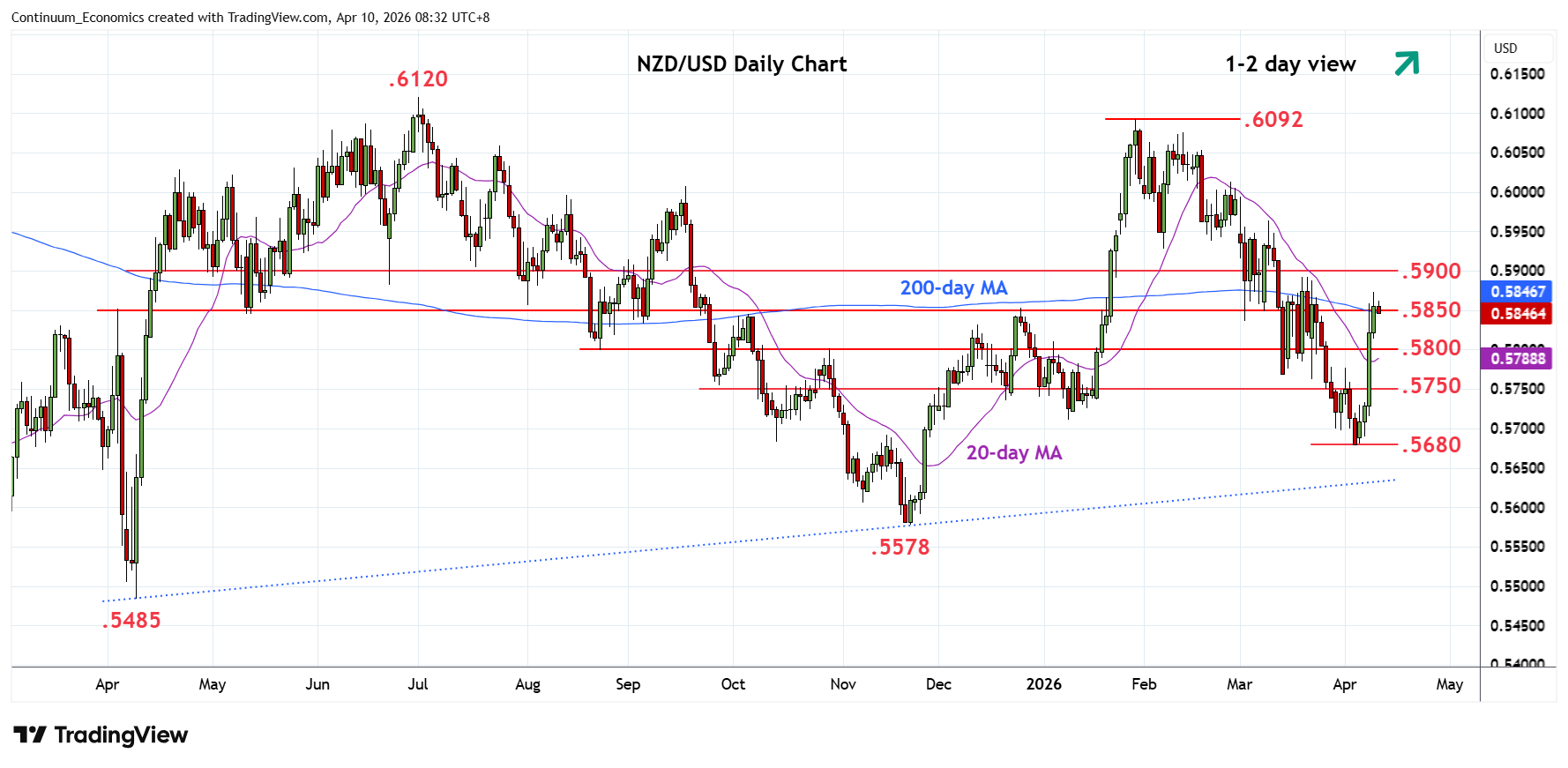 Settled back from the .5874 high to consolidate at the .5850 congestion but pressure remains on the upside