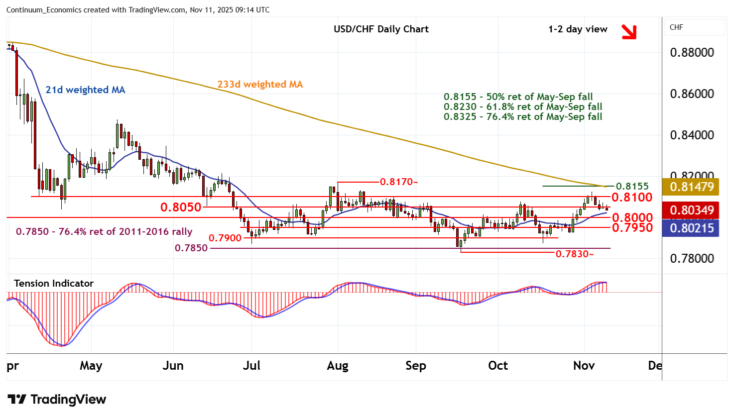 09:05 GMT - Cautious trade around 0.8050 is giving way to a break lower, as intraday studies turn down, with prices currently trading around 0.8035. Both daily stochastics and the daily Tension Indicator are also falling, highlighting room for a test of congestion support at 0.8000. But positive weekly charts should prompt fresh consolidation around here. Meanwhile, a close back above 0.8050 would help to stabilise price action and prompt consolidation beneath 0.8100.