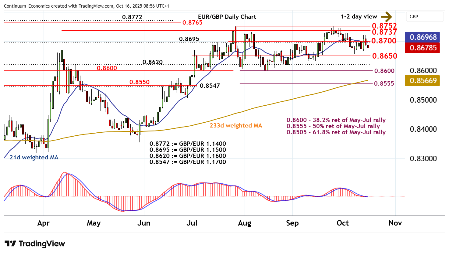 08:45 BST - Minor gains have not been seen, as cautious trade gives way to a break below 0.8695/00. Intraday studies are under pressure and the flat daily Tension Indicator has ticked lower, suggesting potential for continuation towards congestion support at 0.8650. But the rising daily Tension Indicator is expected to limit any initial tests in consolidation, before bearish weekly charts extend losses still further. Meanwhile, a close back above resistance at 0.8695/00, if seen, should give way to consolidation beneath critical resistance at the 0.8752 current year high of 28 July and the 0.8765 high of November 2023.