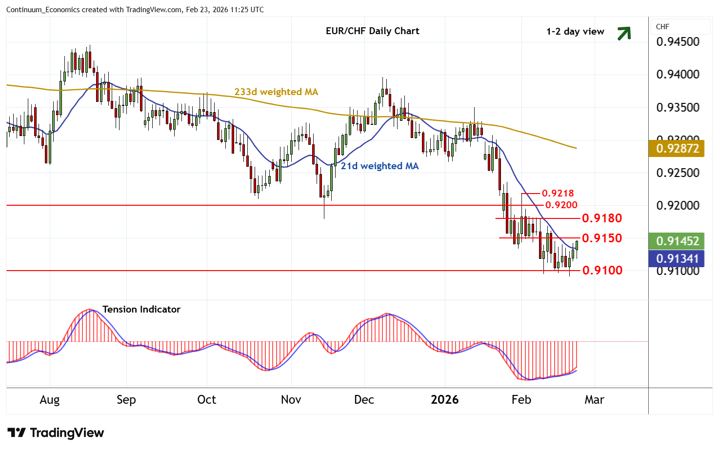 10:55 GMT - Cautious trade is giving way to anticipated tests higher, as intraday studies tick higher, with prices approaching resistance at the 0.9150 range lows. Daily readings are positive and oversold weekly stochastics are edging higher, suggesting room for a break above here. Focus will then turn to congestion around 0.9180. But the bearish weekly Tension Indicator and negative longer-term charts should limit any tests in consolidation. Meanwhile, support remains at 0.9090/00 and should underpin any immediate tests lower.