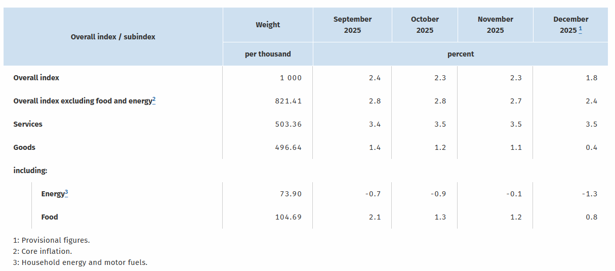 Germany’s disinflation process resumed with a bang as December saw a larger-than-expected fall in both headline and core inflation. Indeed, the headline HICP fell 0.6 ppt to a five-month low of 2.0%. This was largely food and energy driven but still with some fall in core at least according to the CPI measure. Admittedly services inflation was stuck in the CPI measure but the lower core rate must therefore reflect a fall in non-energy industrial goods, this possibly an increasing sign of softer import prices possibly related to Chinese export dumping. Regardless, and as we have suggested before, core adjusted data are telling an ever-more reassuring tale as these preliminary numbers suggest that the pick-up t 3.0% seen in Nov/Oct was fully reversed last month.