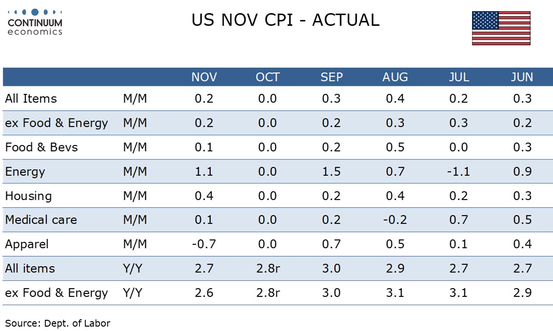 November’s CPI is significantly lower than expected, at 2.7% yr/yr, 2.6% ex food and energy, compared with 3.0% for both series in September (October data will not be released). November’s core CPI index is up only 0.16% from September’s, implying an average rise of less than 0.1% per month over the last two.