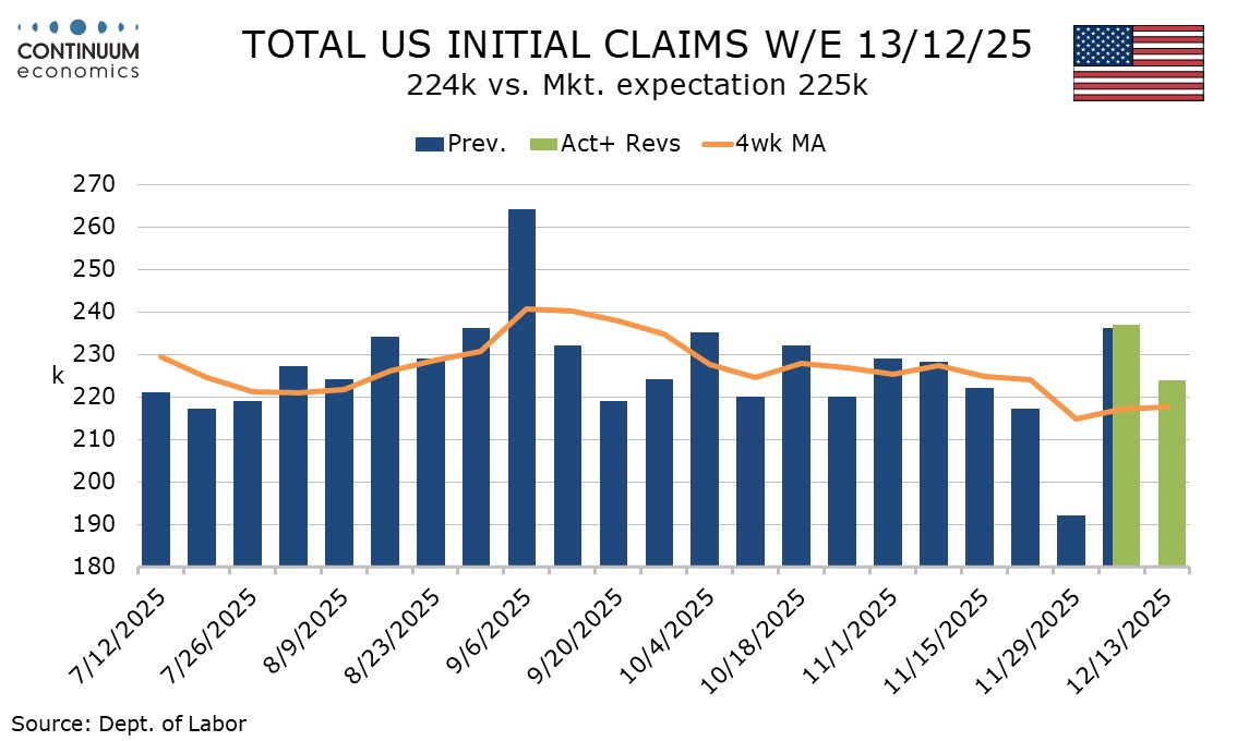 Weekly initial claims cover December’s payroll survey week and at 224k represent a return to trend after last week’s correction higher to 237k from a very low 192k seen in the Thanksgiving week. The 4-week average of 217.5k is down from 224.75k in November’s payroll survey week.