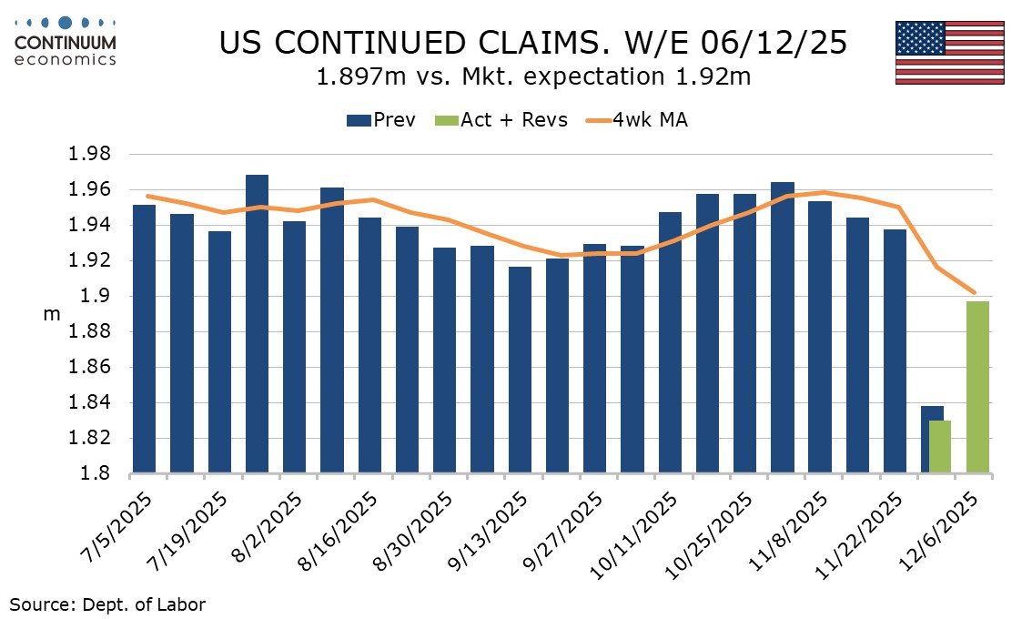 Continued claims cover the week before initial claims and with a 67k rise to 1.897m have not fully reversed a 107k fall in the Thanksgiving week. Trend, which was rising through October, is now falling. The signals for December’s payroll are somewhat positive.