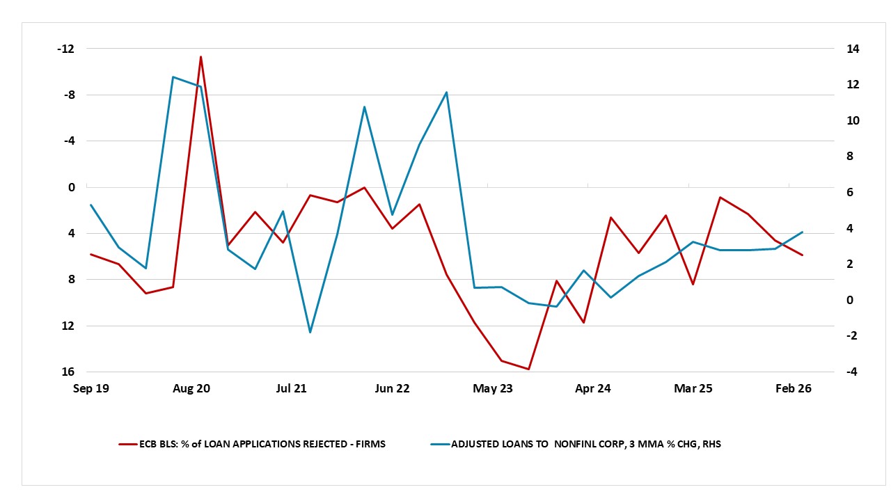 · Banks Getting Warier. Given the late Dec/early Jan timing of the latest ECB survey, which far from fully embraced the added uncertainty caused by President Trump’s trade threats, it was still hardly a surprise despite that the latest Bank Lending Survey (BLS) reported net tightening credit standards. This tightening received only a very brief mention in Lagarde’s press conference. But we think it merits much greater attention and analysis, not least as merely accentuates trends in the three previous BLS but also as it reflected an ongoing and perhaps deeper concerns about the outlook for firms and the broader economy, as well as banks’ lower risk tolerance. This updated BLS therefore echoes what we have seen in other ECB surveys despite somewhat less soft actual credit dynamics seen of late. At least as far as firms and consumers seeking credit are concerned, the BLS again underscores that banks are rationing, if not out rightly curbing, the supply of credit as rejecting a loan is obviously the most stringent manner in which banks can tighten credit standards. In fact, the BLS noted a further net increase in the share of rejected loan applications notably for firms, something that understandably correlates inversely with actual lending and this implies a clear slowing in the latter ahead (Figure 2). As such, the latest BLS both corroborates and continues an ever worrying pattern, namely weakness in corporate credit demand and supply and which suggest ever more clearly that banks are ever warier in regard to lending, especially to firms exposed to export sectors. The question is whether this is even more tangible evidence of the threat posed by U.S. tariffs, alongside global uncertainties, something likely to weigh further credit dynamics the sluggishness of which we see as being driven by tight(er) financial conditions.