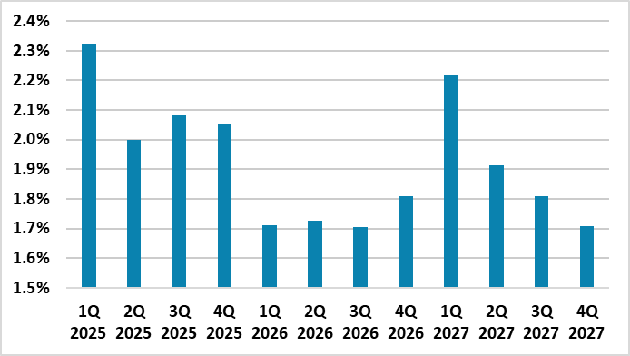 · Steady for now, but. Most on the ECB council appear to be comfortable with steady policy in the next few meetings, after a cumulative 200bps of cuts. However, we agree with the doves concerns. Firstly, the ECB focus on compensation for workers is backward looking, with forward looking data (e.g. Indeed survey and wage tracker) suggesting wage inflation will be consistent with CPI inflation just below target (Figure 1). Secondly, as noted above we feel that financial conditions and lending are worse than the ECB depo rate would suggest. Finally, though defense and infrastructure spending will help Germany in 2026, other major EZ countries are fiscally restrained (see EZ Outlook here). Incoming economic data will build the case for further rate cuts and we have penciled in 25bps cut for the June and September meetings.