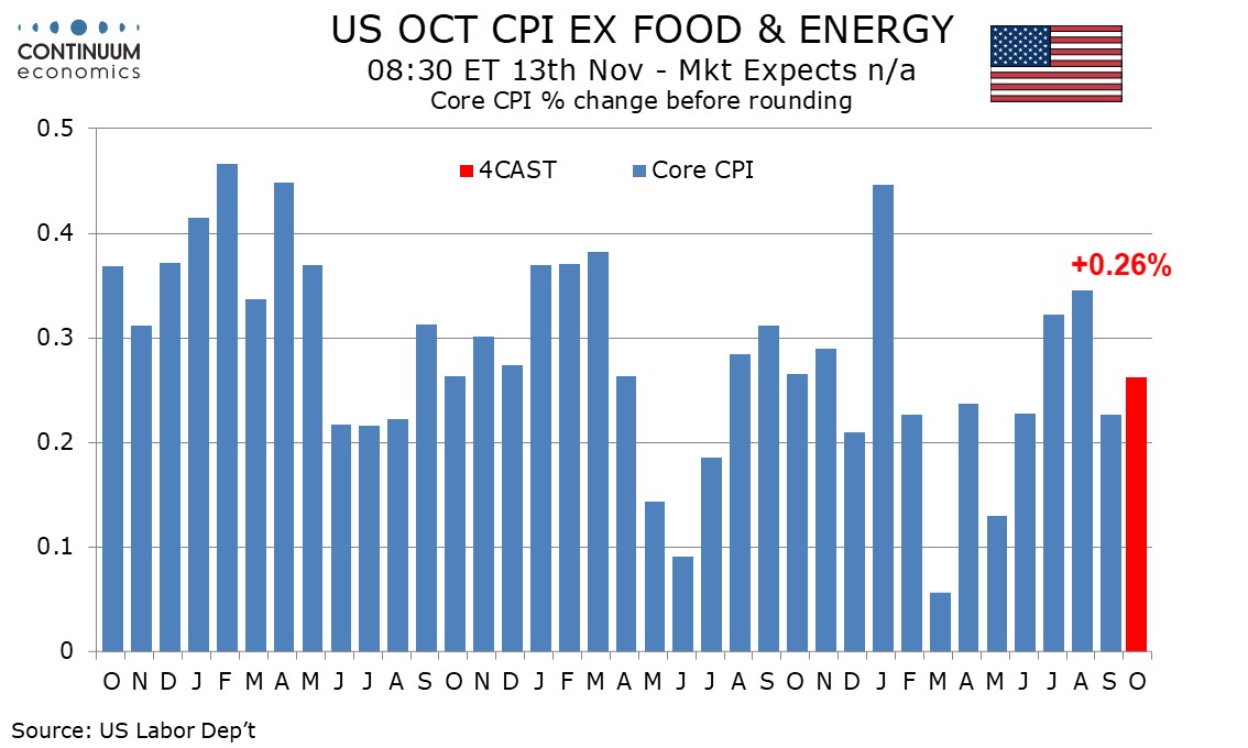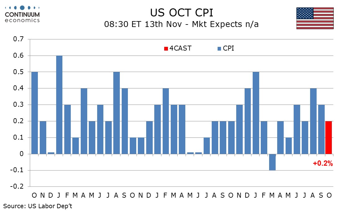 October US CPI, while scheduled on November 13, may never be released even if the government shutdown is resolved, given lack of data collection during the month of October. However what the number would have been does matter. Our forecast is for a 0.2% increase overall, with a 0.3% rise ex food and energy, with the respective gains before rounding being 0.16% and 0.26%.