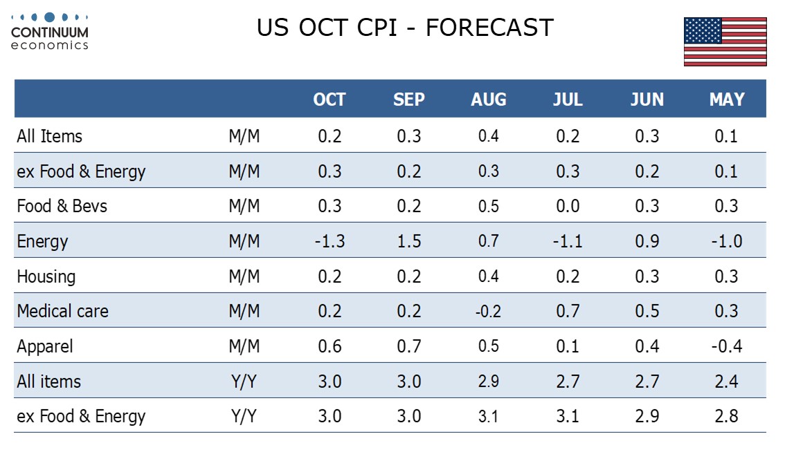 Commodities less food and energy also increased by 0.2% in September, down from 0.3% in August, restrained by a dip in used autos despite tariffs continuing to feed through to several components. We expect used autos will remain subdued in October, keeping the core rate slightly below 0.3% before rounding. Gasoline prices look set to partially correct a September increase that lifted overall September CPI to 0.3% while we expect a 0.3% October increase in food, where tariffs are also being felt. Yr/yr rates are likely to be unchanged from September, at 3.0% both overall and ex food and energy.