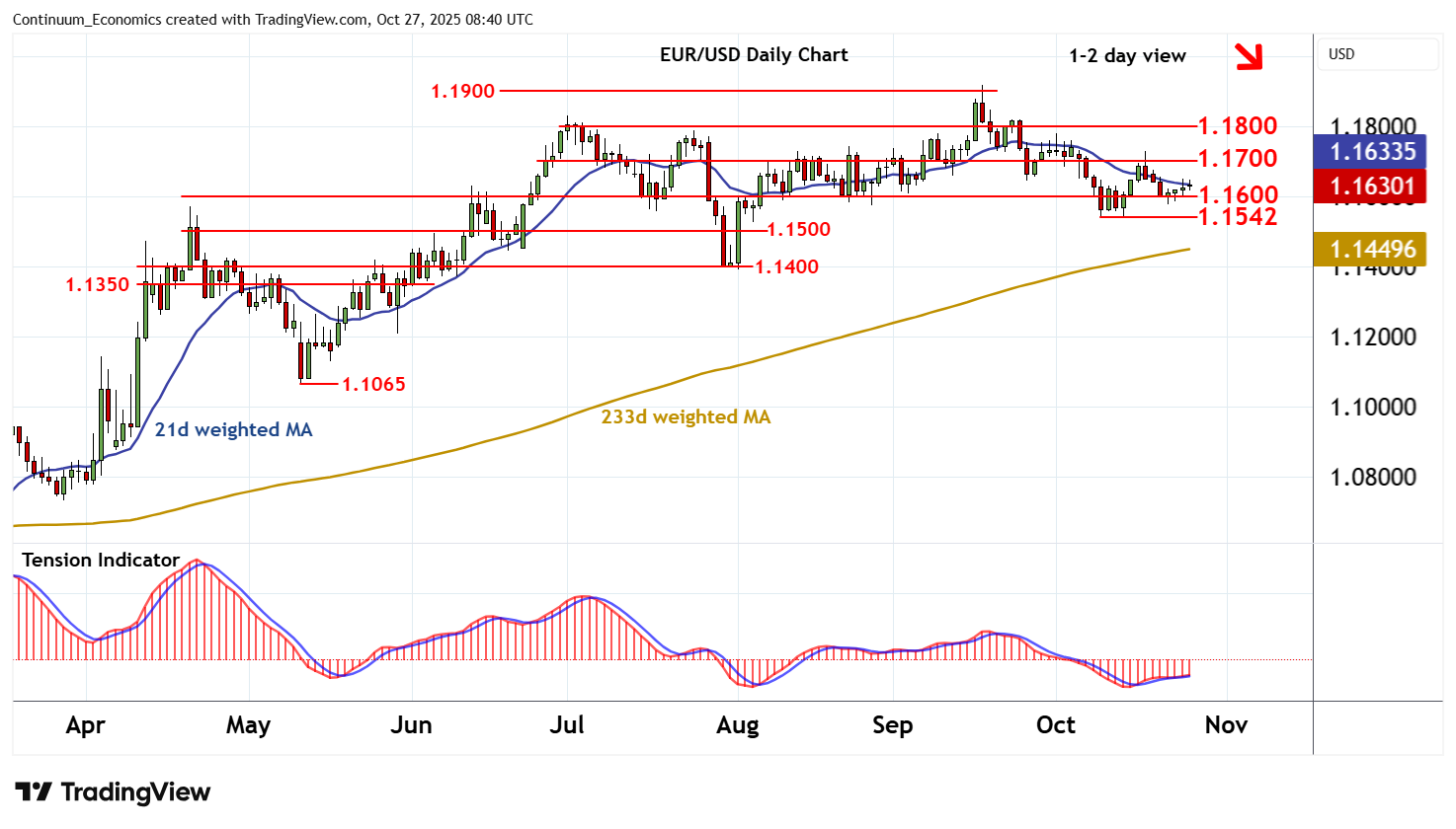 08:30 GMT - Little change, as prices extend cautious trade around 1.1625. Daily readings are mixed/negative and broader weekly charts are under pressure, highlighting room for fresh losses in the coming sessions. A later break below congestion support at 1.1600 will open up stronger support at the 1.1542 weekly low of 9 October. A further close beneath here will add weight to sentiment and extend mid-September losses initially to congestion around 1.1500. Meanwhile, resistance remains at congestion around 1.1700 and extends to the 1.1728 weekly high of 17 October. A close above here is needed, not yet seen, to improve sentiment and extend October gains towards congestion around 1.1800.
