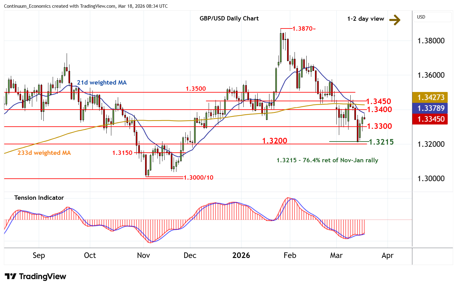 08:10 GMT - Anticipated corrective gains are meeting selling interest around 1.3375, as overbought intraday studies unwind, with prices currently trading around 1.3350. Daily readings continue to rise, suggesting room for a fresh test higher. But negative weekly charts and deteriorating longer-term readings should limit scope in renewed selling interest towards congestion resistance at 1.3400. Following cautious/corrective trade, fresh losses are looked for. A break below congestion support at 1.3300 will add weight to sentiment. But a further close below 1.3200/15 is needed to turn sentiment negative and extend late-January losses towards further congestion around 1.3150.