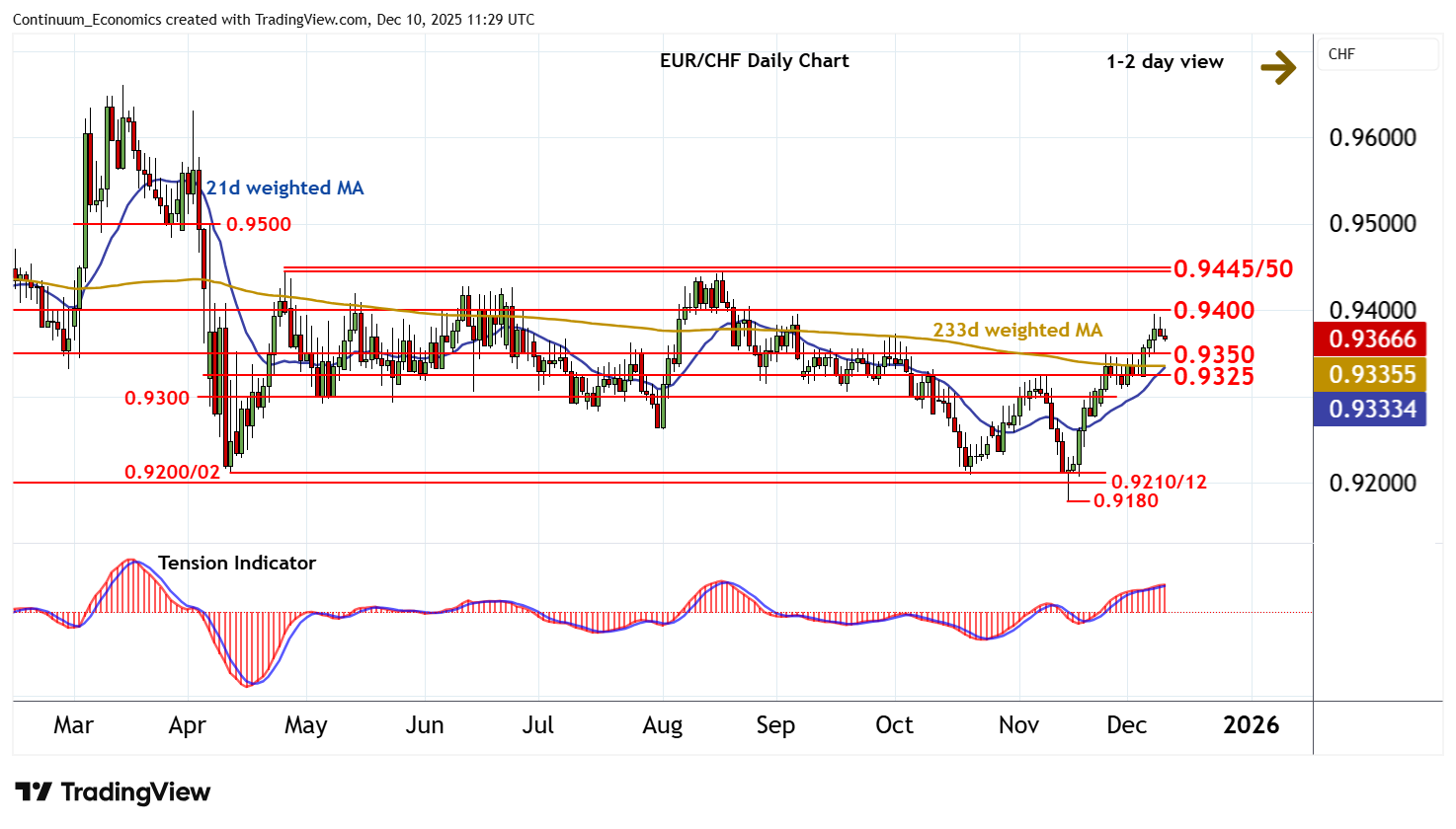 11:05 GMT - The anticipated test above resistance at 0.9400 has not been seen, as intraday studies turn down and add weight to near-term sentiment. Overbought daily stochastics are also unwinding and the positive daily Tension Indicator is flattening, highlighting room for a test of congestion support at 0.9350. A break will add weight to sentiment and open up further congestion around 0.9325. But rising weekly charts are expected to limit any initial tests of this range in fresh consolidation. Meanwhile, a close above 0.9400, not yet seen, will improve price action and extend mid-November gains towards critical resistance at the 0.9445/50~ range highs from April-August.