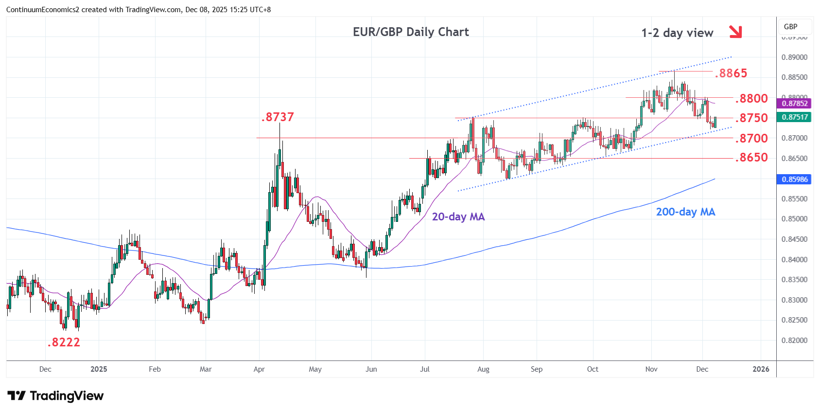 07:20 GMT - Bounce above channel support from the August low see prices unwinding oversold intraday studies and consolidating pullback from the .8800 resistance. Gains are seen corrective and expected to give way to renewed selling pressure later to retrace gains from the May low. Break of the .8720/00 support will open up room for deeper pullback to strong support at the .8655/50, October low and congestion area. Meanwhile, resistance at the .8870/.8800 congestion area is expected to cap and sustain pullback from .8865, 14 November current year high.