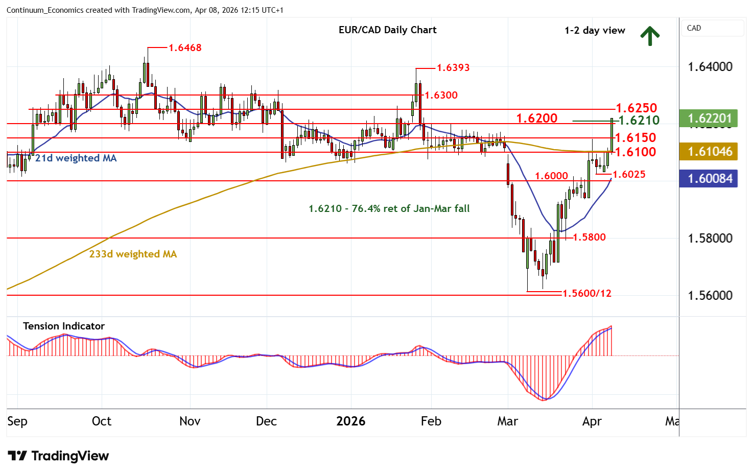 12:00 BST - Anticipated gains are extending in heightened volatility, with prices currently pressuring strong resistance at congestion around 1.6200 and the 1.6210 Fibonacci retracement. Daily readings have ticked higher and broader weekly charts continue to rise, highlighting room for further strength in the coming sessions. A close above here will extend March gains towards congestion around 1.6250. However, already overbought daily stochastics could limit any immediate continuation beyond here in profit-taking towards further congestion around 1.6300. Meanwhile, support is raised to 1.6150. A close beneath here, if seen, will turn sentiment neutral and prompt consolidation around 1.6100.