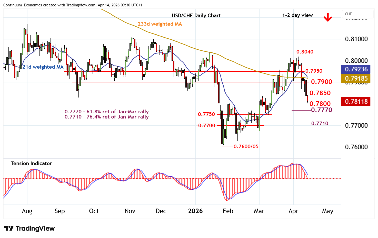 09:20 BST - Anticipated losses are extending, with prices reaching congestion support at 0.7800. Flat oversold daily stochastics are prompting short-term reactions around here. But the negative daily Tension Indicator and bearish weekly charts highlight room for still further losses. A close beneath here will add weight to sentiment and extend late-March losses below the 0.7770 Fibonacci retracement towards congestion around 0.7750. Still lower is 0.7700/10, where more significant short-covering/consolidation could develop. Meanwhile, resistance is lowered to congestion around 0.7850. A close above here, if seen, will help to stabilise sentiment and prompt consolidation beneath further congestion around 0.7900.