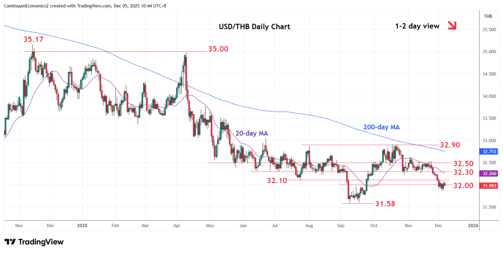 02:45 GMT - Edged up from the 31.85 low to consolidate at the 32.00 level as prices unwind oversold intraday studies. However, this is expected to give way to selling pressure later. Lower will see room to 31.76 support then the 31.58, September current year low. Below these will extend the broader losses from the 2022 year high and see room to support at 31.30 and the 31.00 figure. Meanwhile, resistance is at the 32.10, July low. Regaining this will see room for stronger bounce to resistance at the 32.23/32.30 area which is expected to cap.