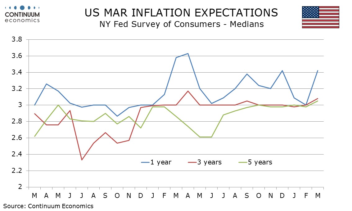 The New York Fed’s March Survey of Consumer Expectations shows expectations have been lifted by the surge in energy prices, most obviously at the 1-year level, but with impacts visible at the 3-year and even 5-year levels.